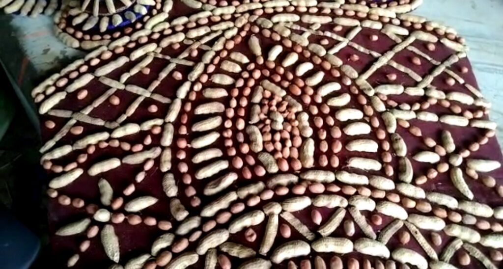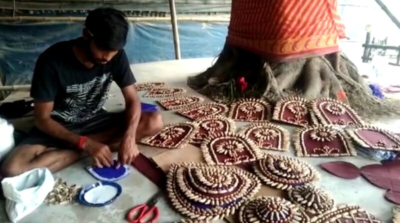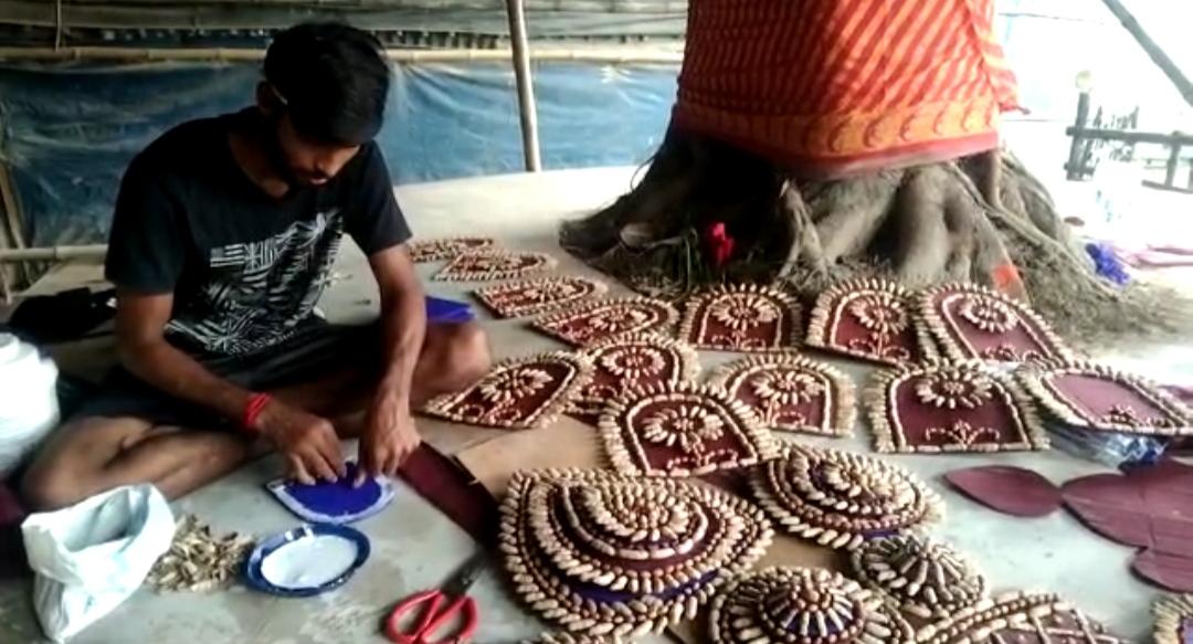 বাদামের খোসা দিয়ে দুর্গা প্রতিমার সাজ তৈরি করতে ব্যস্ত শিল্পী সুশান্ত সরকার।