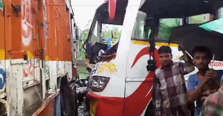 সাতসকালে যাত্রীবাহি বাস ও লরির মুখোমুখি সংঘর্ষ, আহত একাধিক।