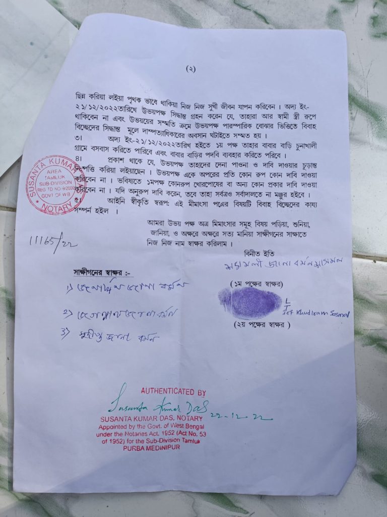 নিজস্ব প্রতিনিধি,নন্দকুমার:-রাতের অন্ধকারে ডিভোর্স তাও কোর্টের বাইরে, দশ টাকার স্ট্যাম্প পেপারের মীমাংসা পত্রে গ্রাম কমিটির মাতব্বরদের ফতোয়ায় হলো ডিভোর্স। ১০ বছর পূর্বে নন্দকুমারের চুনাখালি গ্রামের ক্ষুদিরাম শাসমলের সাথে বিয়ে হয় শ্যামলী শাসমলের। তিনটি কন্যা সন্তান রয়েছে তাদের। বিয়ের পরই ক্ষুদিরাম তার স্ত্রীকে পাঠায় উড়িষ্যায় কাজের জন্য। তারপরেই বিস্ফোরক অভিযোগ শ্যামলীর। অন্য পুরুষের সঙ্গে সম্পর্ক রয়েছে দোহাই দিয়ে ক্ষুদিরাম তাকে ব্যাপক মারধর করেন। তারপরেই শ্যামলী ফিরে আসেন তার বাপের বাড়ি। স্বামীর ভয়ে লুকিয়ে ছিলেন বেশ কিছুদিন। গ্রামে ফিরলে গ্রাম মাতব্বরদের ফতোয়া জারি হয় শ্যামলীর উপর।